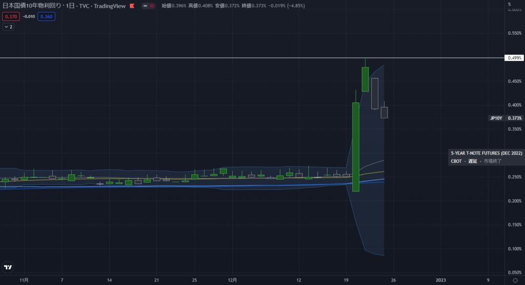 YCCバンド幅拡大が決定された日は、バンド幅いっぱいの0.499%まで売り込まれましたが、その後の二日間は投機筋が攻めあぐねているのがわかりますね。先週金曜日の終値は0.373%という有様です。ざまーねーです。