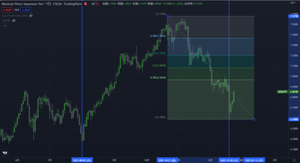 三つ目の利確ポイントは「10/21から12/20までに形成された下降波のフィボナッチリトレイスメント0.786(7.3676円辺り)」です。