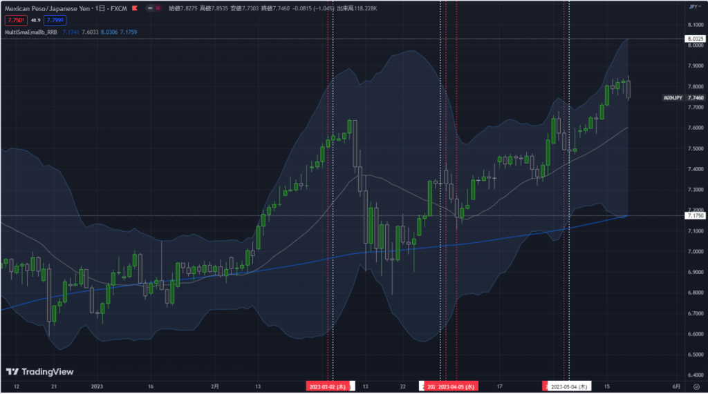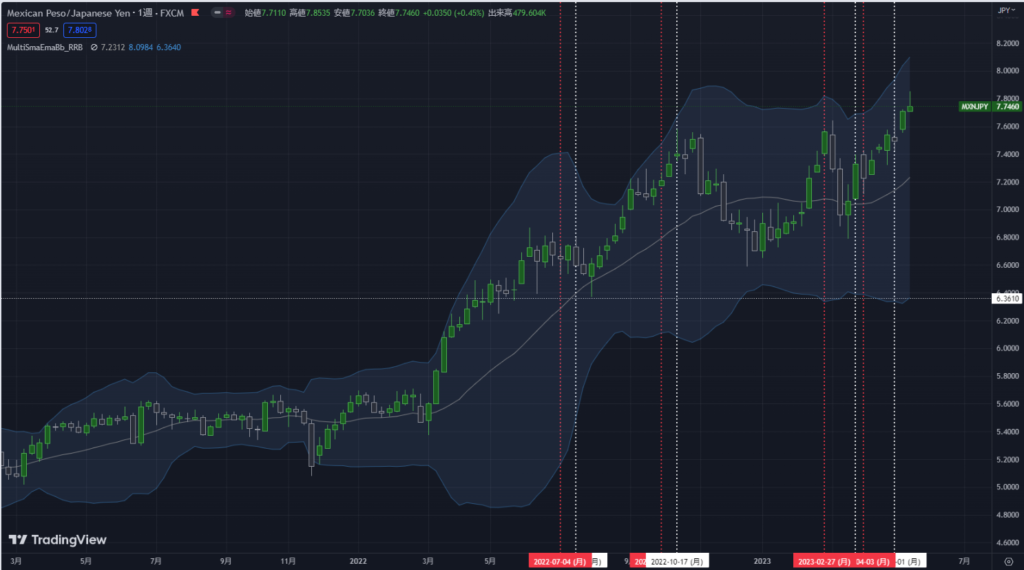 メキシコペソ円の利益確定ポイントについてツイッター(@Ryujuok)でお知らせしましたが、メキシコペソ円が7.8円で頭が重くなったところで一部利確しました。メキシコペソ円の「5pips、10pipsの刻みライン」で頭が重くなったら、小刻みに利確するという方法について、今週も続けたいと思います。 7.8円で利確しているので、今後は7.85円、7.9円と7.95円近くで、上値が重くなったところで小刻みに利確する予定です。 大きめに利確したいポイントは、前回と同じように日足ボリンジャーバンドの+3σですね。現在は、下図のとおり、「8.0325円」辺りに位置します。このポイントは動きますので、価格が近づいてきたらチャートで現在値を確認してください。 今のところ、8円辺りでほとんどの買いポジションを利確しようと思っています。 ![]() |