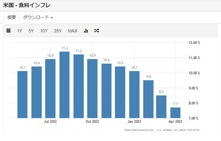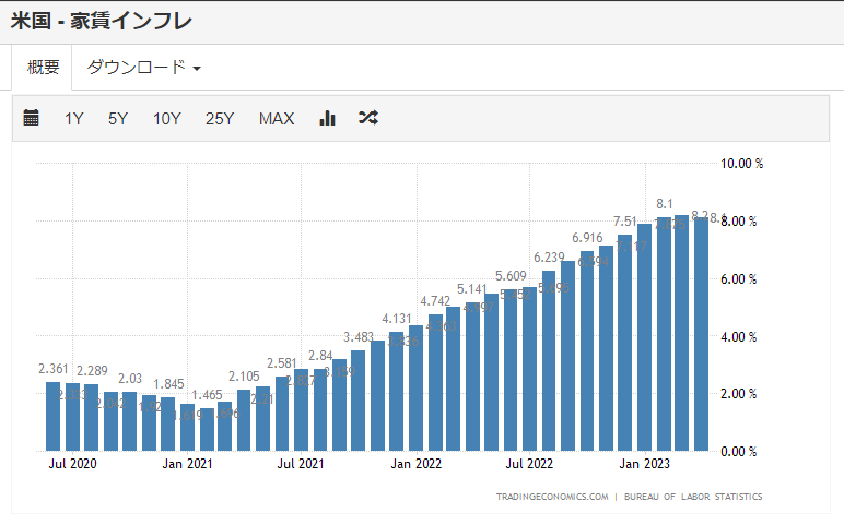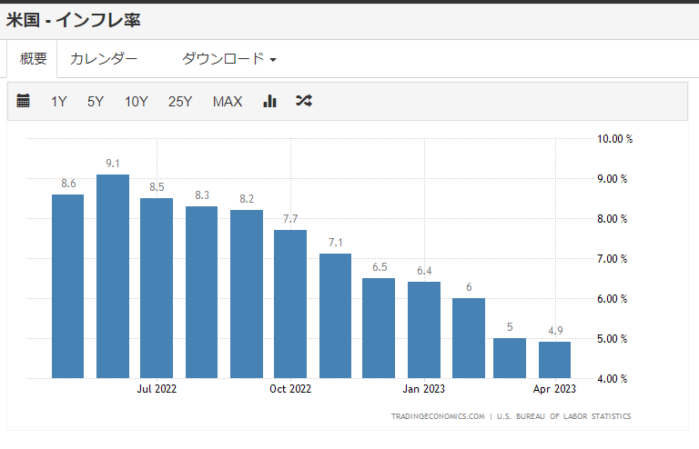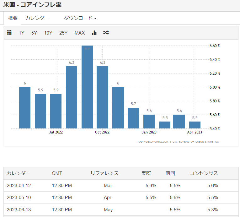 「米)消費者物価指数(CPI)」は大幅鈍化見込み以下は、CPIのうちの食料インフレ(前年比)についてここ一年の推移になります。![]() また、米EIA調査によると、4月から5月にかけてはガソリン価格が低下しており、エネルギーインフレも鈍化が見込まれています。 以下は、住居費(家賃)インフレ(前年比)についてここ三年の推移になります。 ![]() 以下は、CPIの総合指数(前年比)についてここ一年の推移になります。 ![]() 食品とエネルギーを除いたコア指数についても確認してみましょう。 以下は、CPIのコア指数(前年比)についてここ一年の推移になります。 ![]() 最後に、クリーブランド連銀のCPI予想(前年比)も確認しておきましょう。 ![]() 上記のとおり、市場や連銀の予想は、大幅鈍化を見込んでいます。予想どおりまたは予想より低い値になったときは、インフレ懸念が後退しますので、ドル円は急落するでしょう。ドル円の下落につられてメキシコペソ円も下落しますが、メキシコペソがいつも通り強含めば、下げは限定的となりそうです。 |