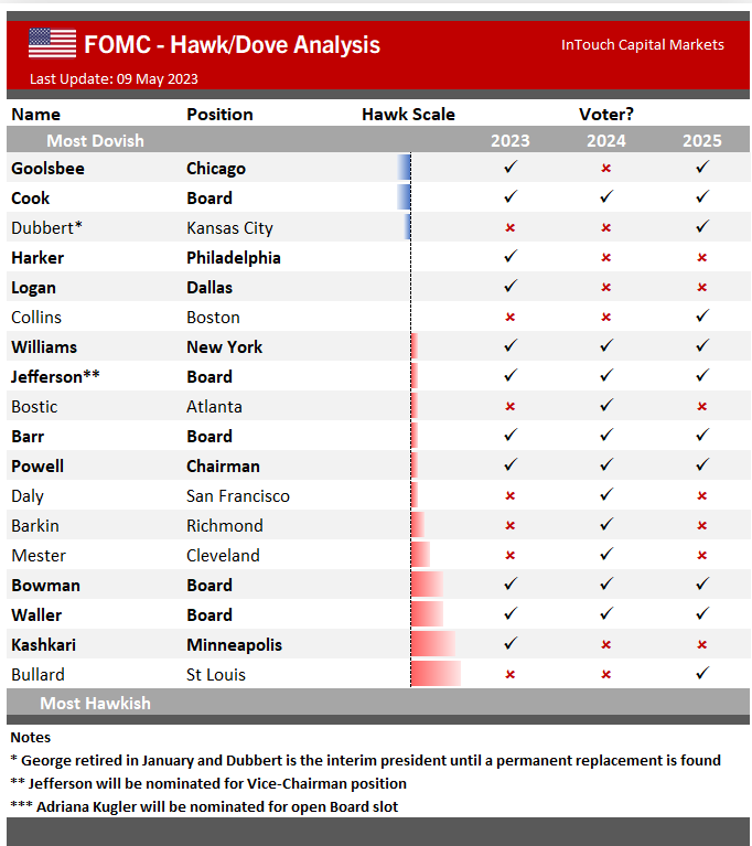 「米)FOMC政策金利」は金利据え置き!?SEPとパウエル議長発言にも要注意!冒頭にも記載したとおり、今回の政策金利については、パウエル議長と副議長に就任する予定のジェファーソンFRB理事の大御所二人が、金利据え置きを示唆しています。しかし、他のFOMCメンバーは金利据え置きと利上げについて意見が割れている状況です。そこで、このブログでよく紹介している「FOMC - Hawk/Dove Analysis」で各メンバーのタカ派・ハト派度合いを確認してみましょう。 ![]() パウエル議長とジェファーソン理事よりもハト寄りなメンバーは5人であり、その一方、タカ寄りなメンバーは3人です。 各メンバーの発言内容は無視して、立ち位置だけで確認すると、今のFOMCはハト寄りだと言えます。今回は、ほぼ金利据え置きで決まりでしょうね。 市場予想では、金利据え置きについて70%が織り込まれており、0.25%の利上げについては30%が織り込まれています。今回、金利据え置きとなれば、日米の金利差に変更はなく、金利差拡大を織り込んでいたドル円相場参加者は失望売りをすることになるでしょう。そうなると、ドル円は下落します。ドル円の下落につられてメキシコペソ円も下落しますが、メキシコペソがいつも通り強含めば、下げは限定的となりそうです。 また、6月は「Summary of Economic Projections(SEP)」がアップデートされます。 以下は、前々回(2022年12月時点)と前回(2023年3月時点)のドットプロットです。 ![]() さらに、声明やパウエル議長の発言で、追加利上げを意識させる内容が報じられた場合、ドル円は上昇することになるでしょう。ドル円の上昇につられてメキシコペソ円も上昇するでしょう。 |