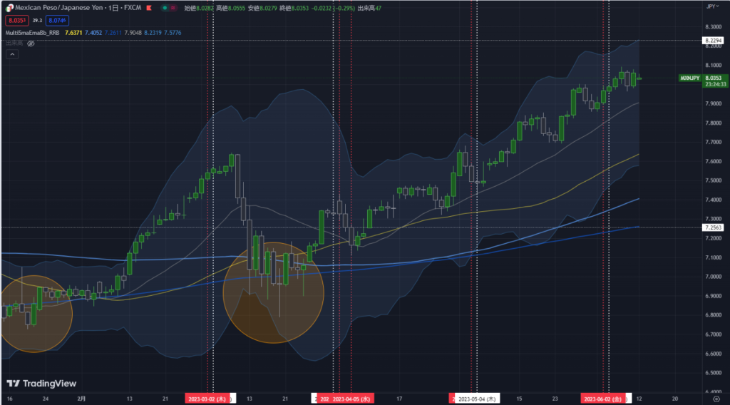 メキシコペソ円の利益確定ポイントについてメキシコペソは相変わらず強いですが、今週も「5pips、10pipsの刻みライン」で小刻みに利確します。なお、先週は、8.05円で利確しています。 大きめに利確したいポイントは、今週も日足ボリンジャーバンドの+3σですね。現在は、下図のとおり、「8.229円」辺りに位置します。このポイントは動きますので、価格が近づいてきたらチャートで現在値を確認してください。 先週までは、このポイントでほとんどの買いポジションを利確するという強気モードでしたが、最近のメキシコペソの強さを考慮して、今週からは控えめに利確したいと思っています。 ![]() |