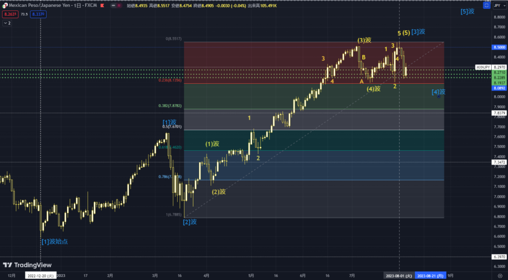 以下はメキシコペソ円の日足チャートにエリオット波動のカウントをプロットしたものです。