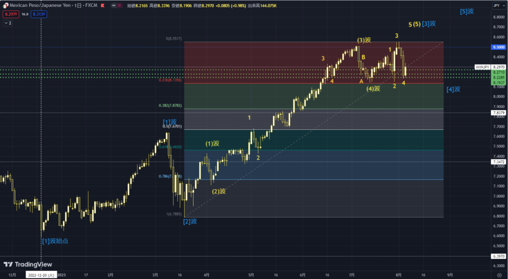 現在、[3]波のうちの(5)波を形成している最中です。さらに詳細に波動をカウントすると、前々日(先週木曜日)に(5)波のちの4波が終了しており、前日(先週金曜日)は(5)のうちの5波を形成し始めました。この5波は3波を上回りますので、今週は、直近天井値である8.5517円を上回る公算が大きいでしょう。