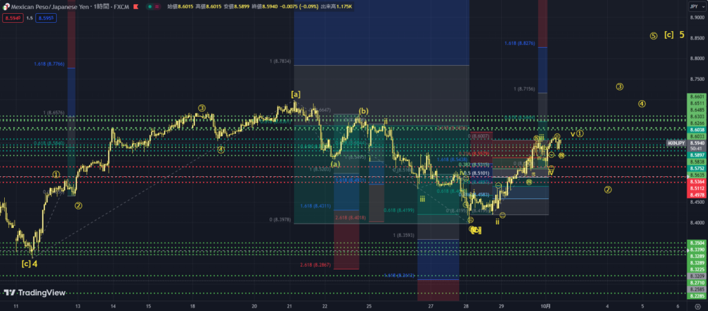 メキシコペソ円も堅調であるが、メキシコペソ米ドルの修正が始まった場合、修正の値動きになりそうメキシコペソ円も底堅さを見せていますが、エリオット波動のカウントからいうと、第5波による最後の一上げがあって、その後は修正する値動きとなりそうです。![]() 修正のタイミングは、ドル円が150円越えをあきらめて落ちた頃、また、前項目で述べた通り、メキシコペソ米ドルでB波による修正が始まった頃になりそうです。 なお、メキシコペソ円がどこまで上昇するのか、フィボナッチ比率で予想してみましょう。 ![]() ➀波のうちのⅴ波が進行中としてカウントをしているわけですが、ⅴ波の値幅は、ⅰ波値幅と同じ幅程度、または、ⅲ波値幅の0.618倍程度になる性質があります。 ⅰ波値幅と同じ幅程度の場合、8.6120円程度まで上昇するでしょう。その一方、ⅲ波値幅の0.618倍程度の場合、8.6464円程度まで上昇するでしょう。 |