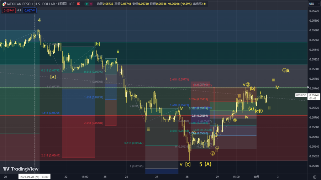 最後の一上げ後に修正が起こりそうなメキシコペソ米ドルメキシコペソ米ドルは、メキシコ中銀の金融政策決定会合後にセンチメントが回復したことで底堅い値動きを見せています。ただし、エリオット波動のカウントでいうと、第五波による最後の一上げといったところ。波動のカウントについて確認しましょう。 ![]() 現在、A波のうちの➄波が進行しているようです。➂波がしっかり五つの波を形成したことを確認できましたので、A波は衝撃波ということになりますので、➄波も五つの波を形成して上昇するでしょう。 ただし、A波が終了をすれば、修正波であるB波が始まりますので、注意してください。 |