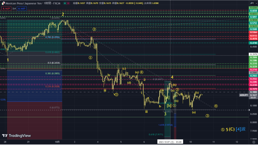 メキシコペソ円は、最後の一下げとなるか!?昨日は、中間反騰で上昇してから、直近底値を下回って下落すると記載しました。その後の値動きを確認すると、すでに中間反騰は終わっていたようで、昨日は直近底値を下回って下落してしまいました。そのため、エリオット波動のカウントを以下のように変更しました。 ![]() 添付図のとおり、10/7 3:00に4波終点をプロットしています。中間反騰である4波はこの時点で終了していたようです。その後、5波により下落し続けました。 現在は、5波のうちの➂波が進行しているようです。チャートを見た感じ、下値をしっかり固めており、これから上昇していこうとしています。しかし、エリオット波動のカウントによると、これから下落することになるみたいです。 いったい、どこまで下落するのか!? 5波は3波値幅の0.618倍程度になることが多いです。価格でいうと、7.9171円程度まで下げることになりそうです。 5波の終わりは、[4]波が終了することを意味します。つまり、5波が終わると、[5]波が始まります。[5]波は[3]波終点(8.7765円)を上抜いて上昇します。早く始まってほしいものです。 |