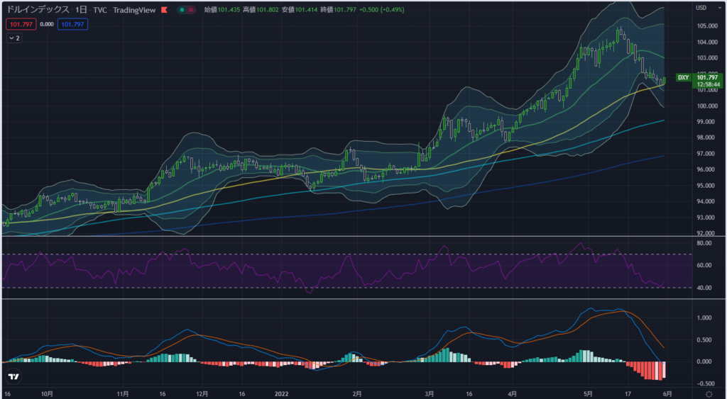 下図はドルインデックスの日足チャートです。ローソク足チャートの下にあるのがRSIチャートであり、その下にあるのがMACDチャートになります。