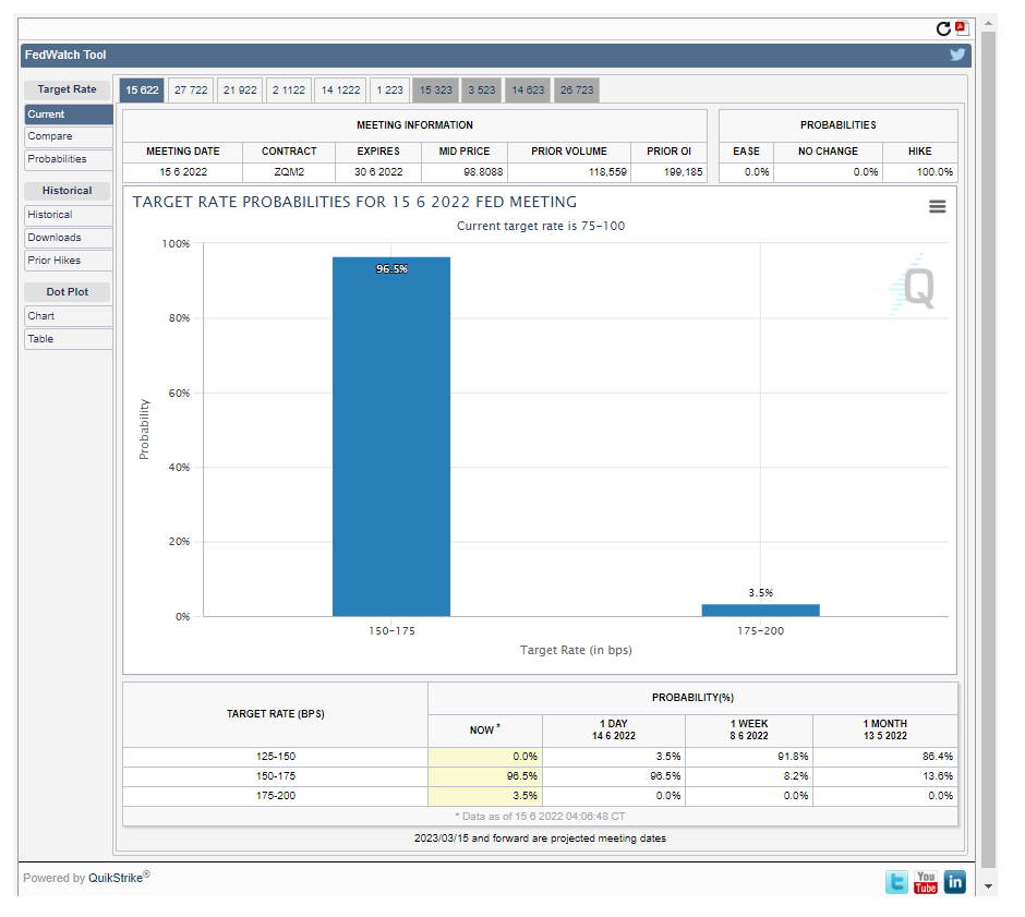 「1.5-1.75%」の予想確率が96.5%です。これは前回より、0.75%も上昇すると見込まれています。政策金利というものは、0.25%上昇させるのが定石のため、通常時より3倍も上昇すると市場は予想しています。