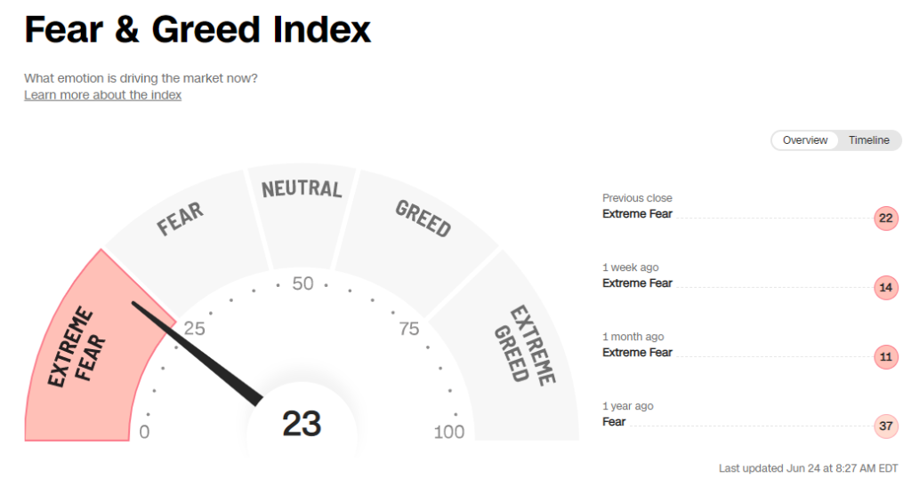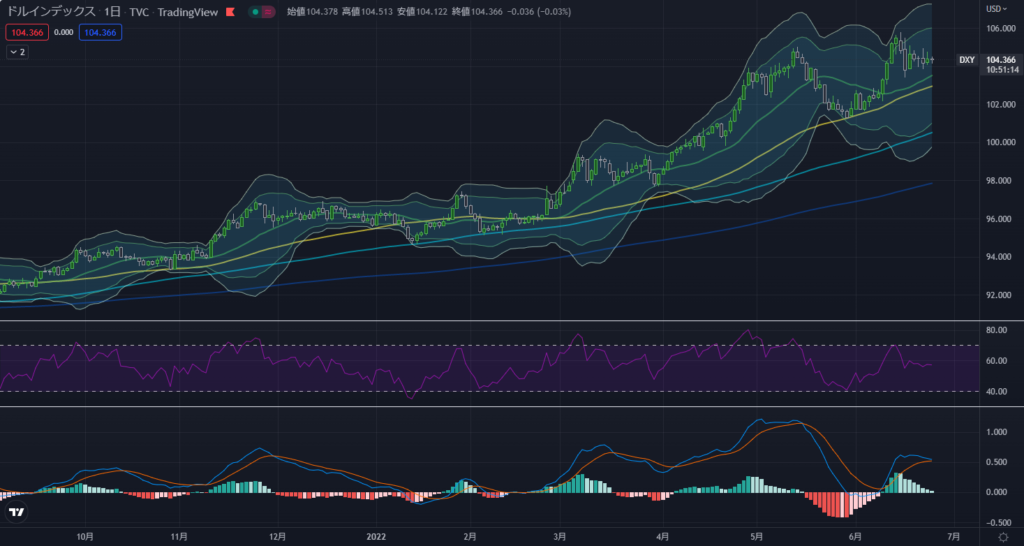 パウエルFRB議長の議会証言(2日目)は内容変わらず、相場は方向感の乏しい展開…昨日日本時間23:00に発表されたパウエルFRB議長の議会証言(2日目)は、今までの証言と差異のある内容はなく、証言の発表後、今までの流れを受けて円安気味に動いています。ドルストレート相場はどっちつかずで方向感の乏しい値動きをしています。下図はドルインデックスを掲載していますが、値動きのネタがなく横ばいに推移している様子が窺がえます。 ![]() 7/27に発表される米国政策金利(FOMC)の市場予想は下図のとおりです。パウエルFRB議長の議会証言(2日目)もタカ派的は内容だったため、前回のFOMCと同様に0.75%上昇させるものとして市場は織り込んでいます。 ![]() 下図は米国債10年物利回り(長期金利)の日足チャートになります。昨日より上昇していますが、MACDはデッドクロスを形成しており、下落を示唆しています。 米国債10年物利回りが下げれば下げるほど、米国株も上昇して金融市場は安定してきます。米国債10年物利回りは常に注視しましょう。 ![]() 米国株については、昨晩、S&P500が0.95%上昇しており、現在、先物市場でも上昇しています。 最後に、下図のCNN Fear & Greed Indexを確認しましょう。昨日の22から23に上昇して、まもなく Extreme Fear から Fearに回復しそうです。 ![]() |
