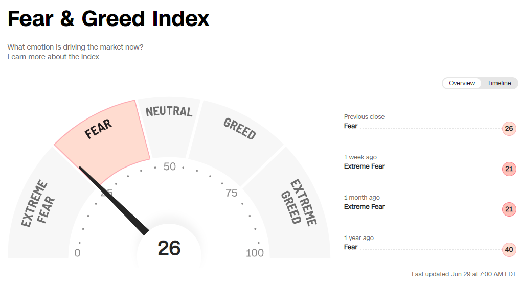 下図のとおり、CNN Fear & Greed Indexも 悪化して、ギリFearに留まっています。