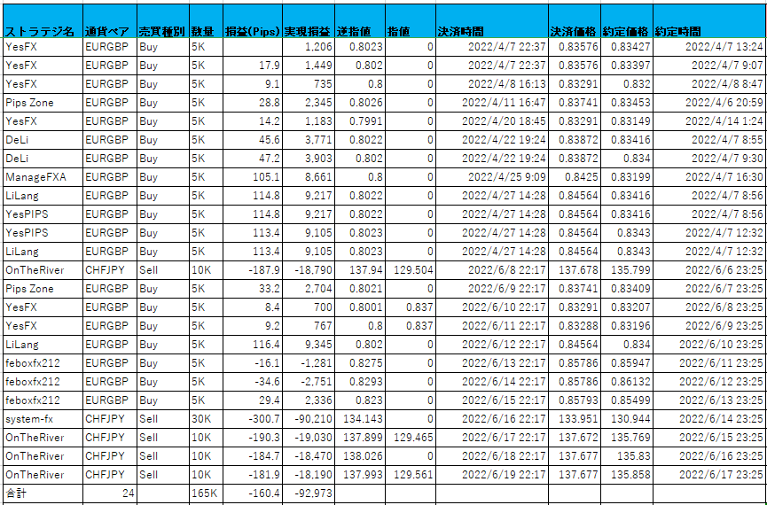 決済履歴一覧の決済時間と約定時間に誤りがありました1週間前ほどから、以下のEXCEL書式の表を掲載するようになりましたが、この書式の表に関して、決済時間と約定時間に誤記入がありました。セルのコピペミスです。誤っている決算履歴一覧 ![]() 正しい決算履歴一覧 ![]() 正しい内容に修正してから、「決済時間」列で昇順ソートをしています。 間違えた内容を掲載してしまい、申し訳ございませんでした。 |