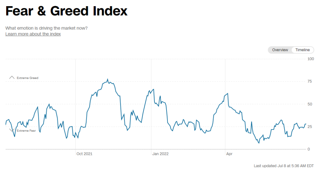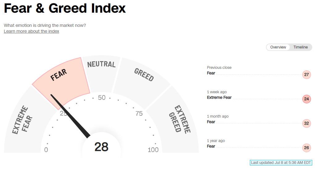 CNN Fear & Greed Indexで金融市場の安定ぶりを確認してみると、昨晩ついに6/24から続いていたExtreme Fearを脱し、下図のとおり、現在はFearに回復しています。