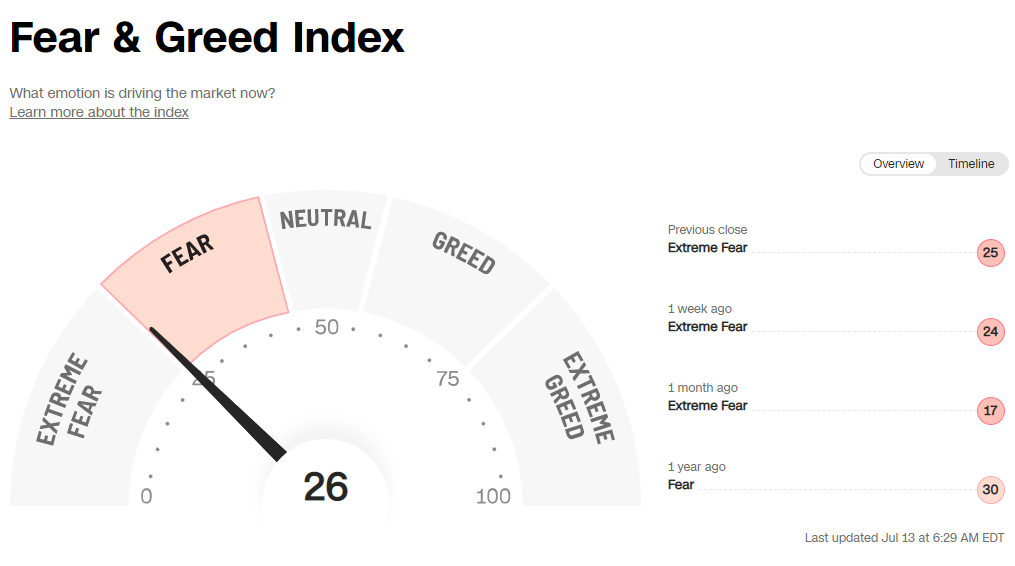 現在の「CNN Fear & Greed Index」は下図のとおりです。ギリFearです。昨日、このブログで記載したとおり、下がりましたね。