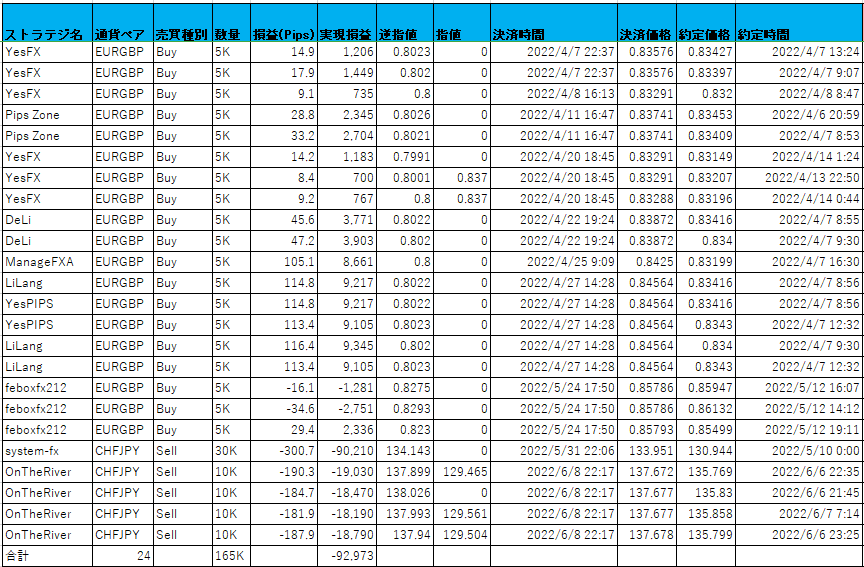 なお、有効にする予定のストラテジーは以下のとおりです。GBPUSDのストラテジはないので、ご注意ください。