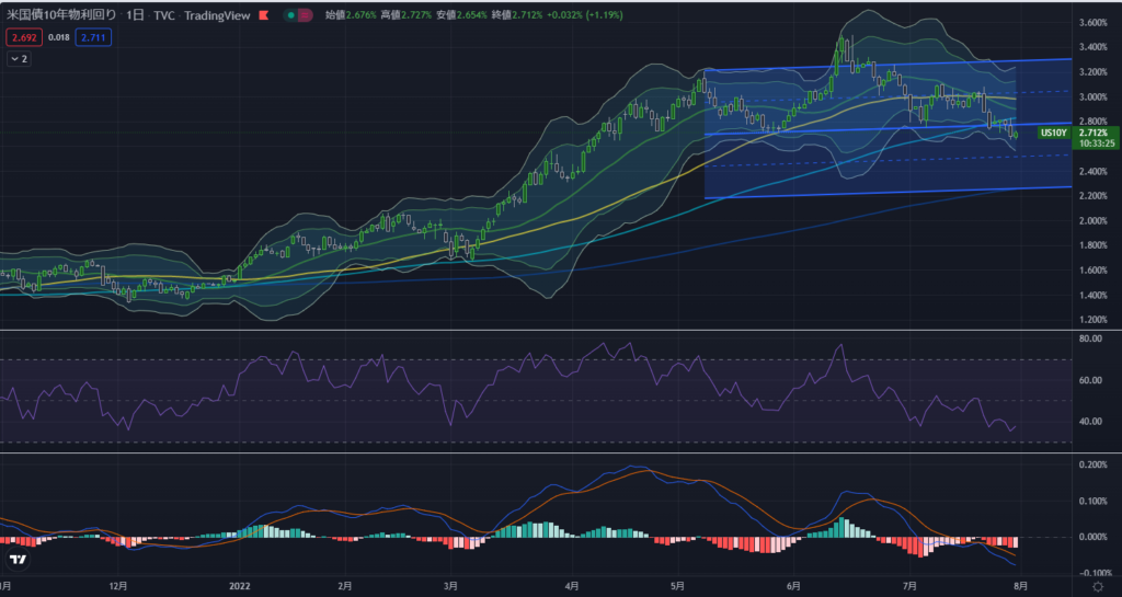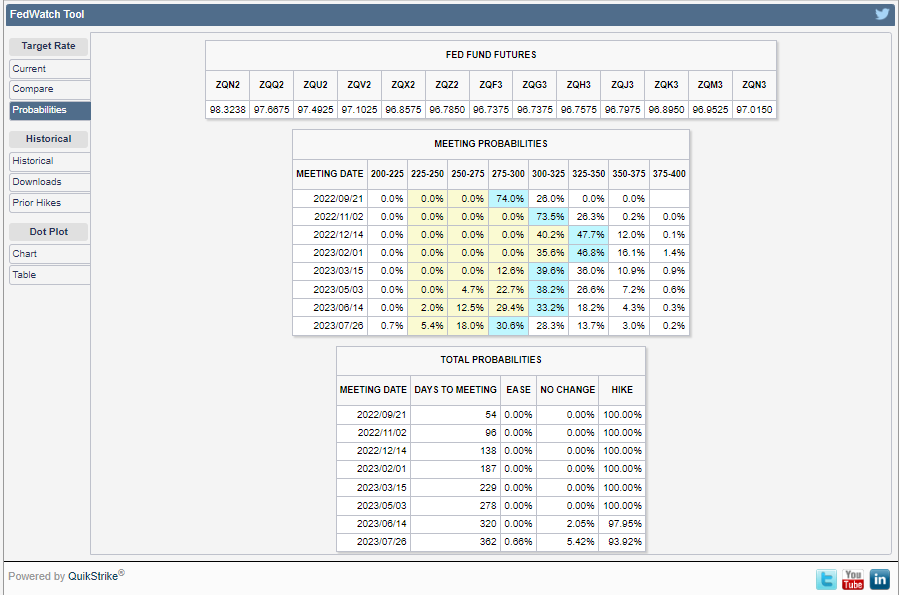 市場はインフレ懸念よりもリセッション懸念にフォーカス下図は、先日、本ブログで紹介した米国債10年物利回りの日足チャートです。ヘッドアンドショルダーのネックラインを下抜けました。 メジャーターゲットラインは、2.200%辺りになります。 ![]() 下図は、FF金利先物が反映されたFedWatch ToolのProbabilities(将来の見込み)です。水色セルが最も確率が高いポイントであり、そこを注意してみてください。 ![]() 次回9/21のFOMCでは、0.5%の利上げが予想されています。その次は0.25%の利上げ、その次も0.25%の利上げ、その後は利下げに転じると予想されています。 一昨日のFOMCで、市場参加者からパウエルFRB議長がハト派に転じたと解釈され、利上げはすぐにでも軟化するものとしてトレードされています。 利上げの軟化を受けて米国株も上昇し続けています。 昨日の「米国第2四半期GDP【速報値】」発表後、安全資産である円と金も急騰しました。 リセッション懸念に備えたトレンドが形成されつつあります。 |