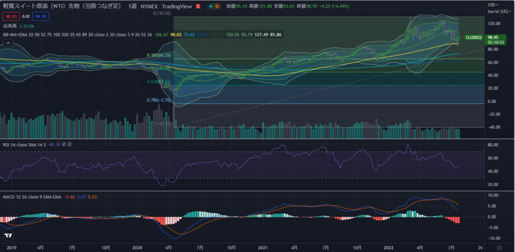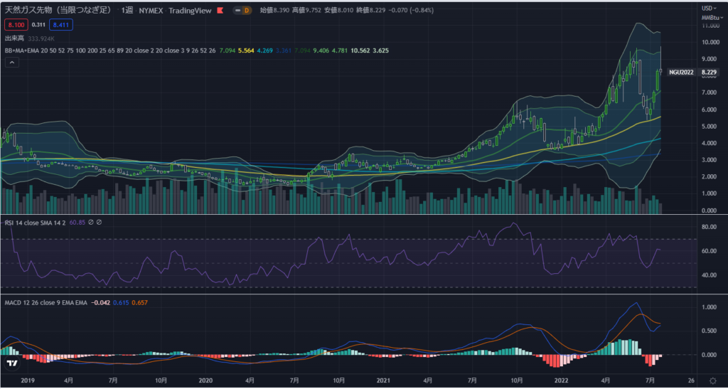 今週は、直近最高値を超えましたが、ローソク足は下落のサインである長い上髭を作りました。天然ガスは地政学的リスクの影響をが非常に受けやすいため、ローソク足だけを見て胸を撫でおろすことは叶わず、価格の高騰について予断を許さない状況です。なにせRシアが出し惜しみをして価格を吊り上げようとしていますからね。