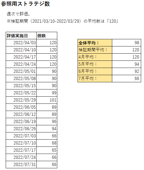 再評価後選抜された参照用ストラテジーは前回と同一先週の再評価後の記事になりますが、別の記事を上書きしてしまって、内容が異なっていました。下書き等も残っておらず、先週分に関しては削除いたしました…申し訳ございません。さて、気を取り直して、今週のストラテジーの再評価が完了しました。 今回選抜された参照用ストラテジー数は66個でした。 下表は、今まで確認した再評価後の参照用ストラテジ数についてまとめたものです。 ![]() 検証期間を含む「2021/03/10-2022/04/30」の1年1か月は、平均120個の参照用ストラテジが選抜されていました。 今年5-6月の期間の参照用ストラテジ数については平均93個選抜されていました。 今年7月に入ると、選抜された参照用ストラテジ数が、がくんと下がり、平均66個でした。ストラテジの調子が良かった「2021/03/10-2022/04/30」期間と比べると、半減しました。 やはり、インフレ懸念とリセッション懸念が増大したことで相場が荒れまくり、成績を下げたストラテジが増えたといえるでしょう。 また、今月に選抜された参照用ストラテジ数を確認すると、65個未満にならないことが確認できます。今月に入って、選抜された参照用ストラテジに入替があまり起きていないことから、それら65個の参照用ストラテジは、選りすぐりのストラテジであるともいえます。それら65個のストラテジについては、激荒れ相場であっても成績を落としておらず、荒れ相場に対して対応能力が高いストラテジといえます。 |