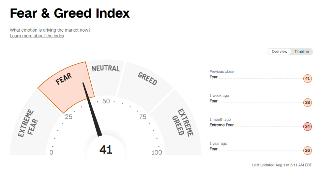 以下のとおり「CNN Fear & Greed Index」の現在値は41です。昨日より一つ下げただけになります。