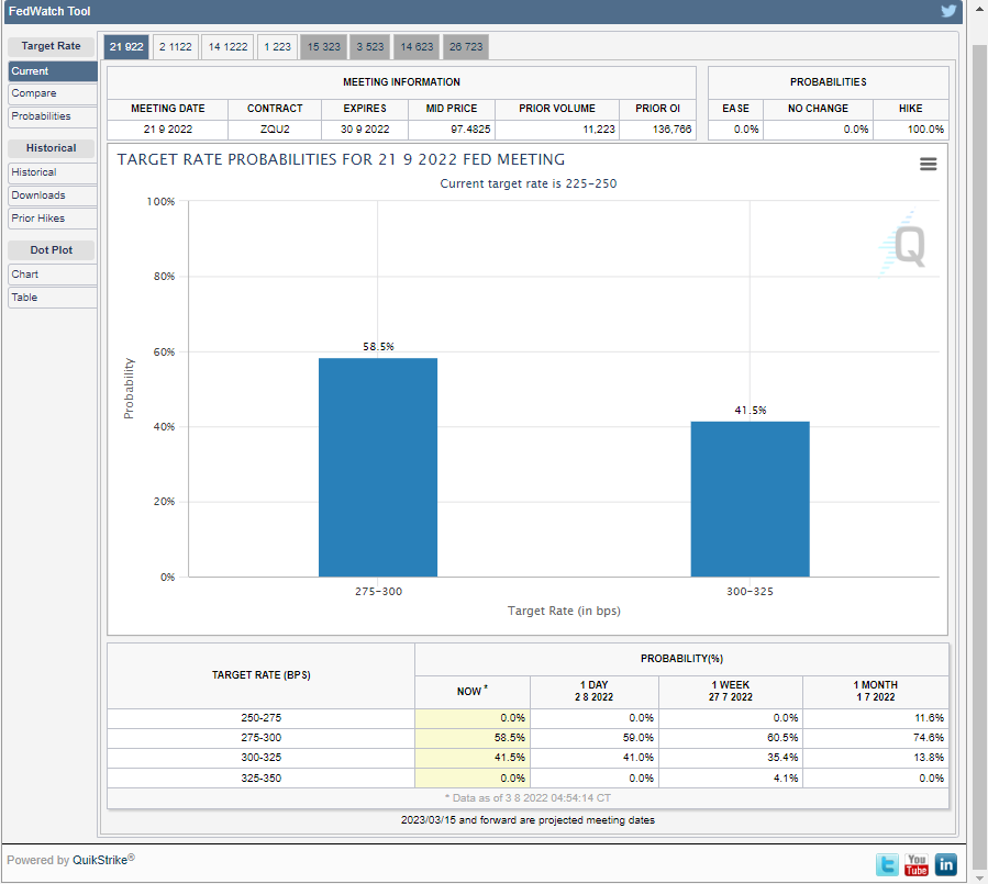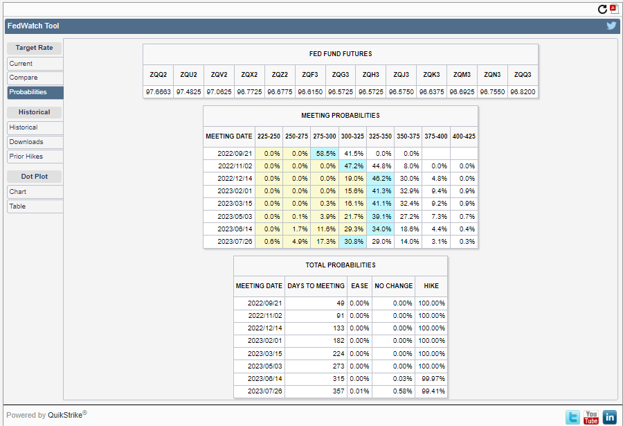 FF金利先物の値動きが反映された「FedWatch Tool」によるFF金利予想は下図のとおりになりました。 昨日までは圧倒的に0.5%の利上げが優勢でしたが、インフレ懸念が強くなったため、 0.5%の利上げと0.75%の利上げが拮抗してきました。 ![]() また、下図のProbabilities(将来の見込み)を確認すると、今まで来年5月の利下げ予想か最も高かったのに対して、来年7月の値下げ予想が最も高いくなりました。値下げはもっと先に行われると予想されるようになりました。 ![]() |
