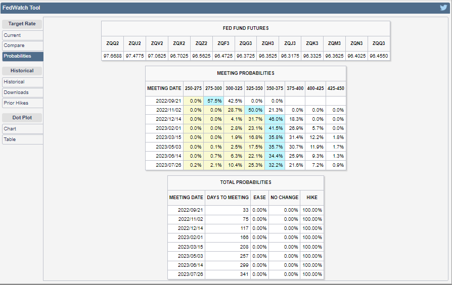 次回(2022/09/21)のFOMCでは、0.50%の利上げ予想が最も確率が高いですが、0.75%の利上げ予想と拮抗しています。それ以降は、0.25%程度の利上げしか予想されていません。