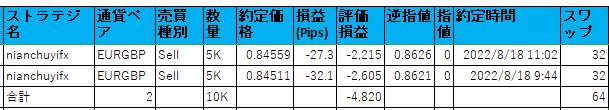 EURGBPが売建玉と買建玉の両方を保有したため、ストラテジーを有効にしていません。