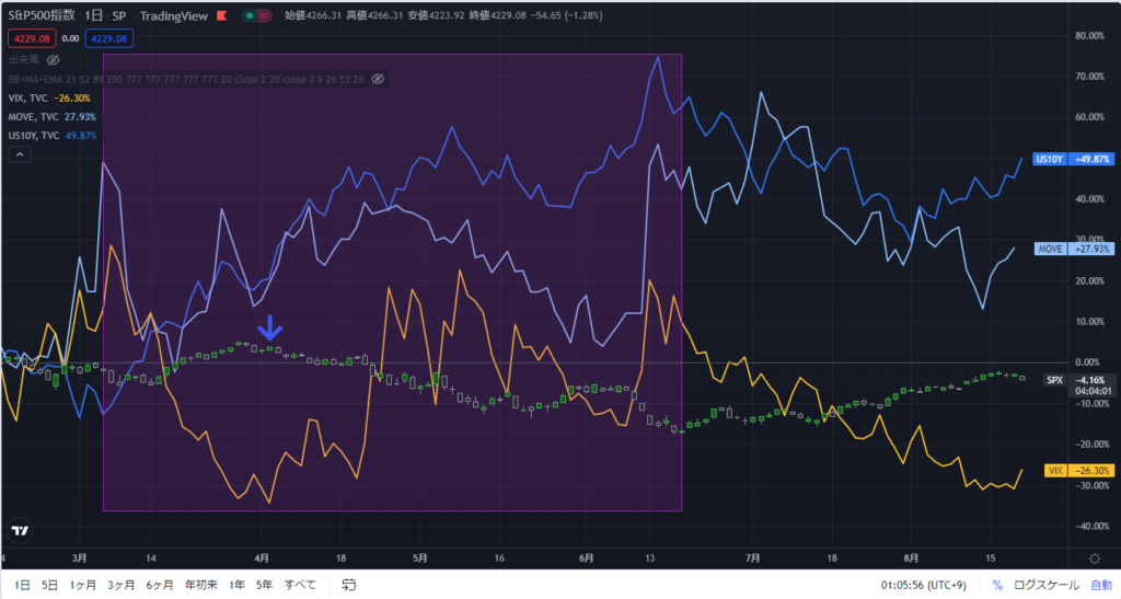 二つのボラと長期金利で読み解く米国株暴落の将来タイトルにあります二つのボラとは、「VIX指数」と「MOVE指数」のことです。「VIX指数」はご存じの方が多いかと思います。 「VIX指数」は米国株式市場における恐怖指数とも呼ばれており、何らかの要因により株式市場のリスクが高まり、今後の株式市場のボラティリティが高まると予想されるときに数値が上昇します。 その一方、「MOVE指数」は、債券バージョンの恐怖指数です。何らかの要因により債券市場のリスクが高まり、今後の債券市場のボラティリティが高まると予想されるときに数値が上昇します。 「VIX指数」の数値が極めて高くなると、米国株式は急落するといわれています。また、「MOVE指数」の数値が極めて高くなると、米国債は急落し、長期金利(米国債10年物利回り)は急上昇するといわれています。 それでは、ちょっとややこしいチャートをご覧いただきたいと思います。 ![]() S&P500の日足チャートに、VIX、MOVE及び長期金利(US10Y)のチャートをマージしたものです。 半透明紫色のボックスで囲った個所は、今年4月から5月にかけてS&P500(ローソク足のチャート)が下落したポイントです。 ボックスの左端をご覧ください。 MOVE(水色ラインチャート)が急上昇しているのが確認できます。その後、長期金利(US10Y・青色ラインチャート)が上昇を始めていますね。その間、VIX(黄色ラインチャート)は、4月初頭まで下落して、4月18日辺りまで横ばいに推移しMOVEと乖離しているのがわかります。乖離が続いた後、VIXはMOVEの上昇に牽引されるように上昇していることを確認できます。 VIXが上昇している間は、S&P500は下落し続けています。 全体の流れをまとめると以下のようになります。 MOVE上昇 ⇒ 長期金利上昇 ⇒ MOVEとVIXが乖離 ⇒ VIX上昇 ⇒ S&P500下落 いつもこの流れで相場が動いているわけではありません。 この傾向は、コロナショック後に見られるようになりました。 |