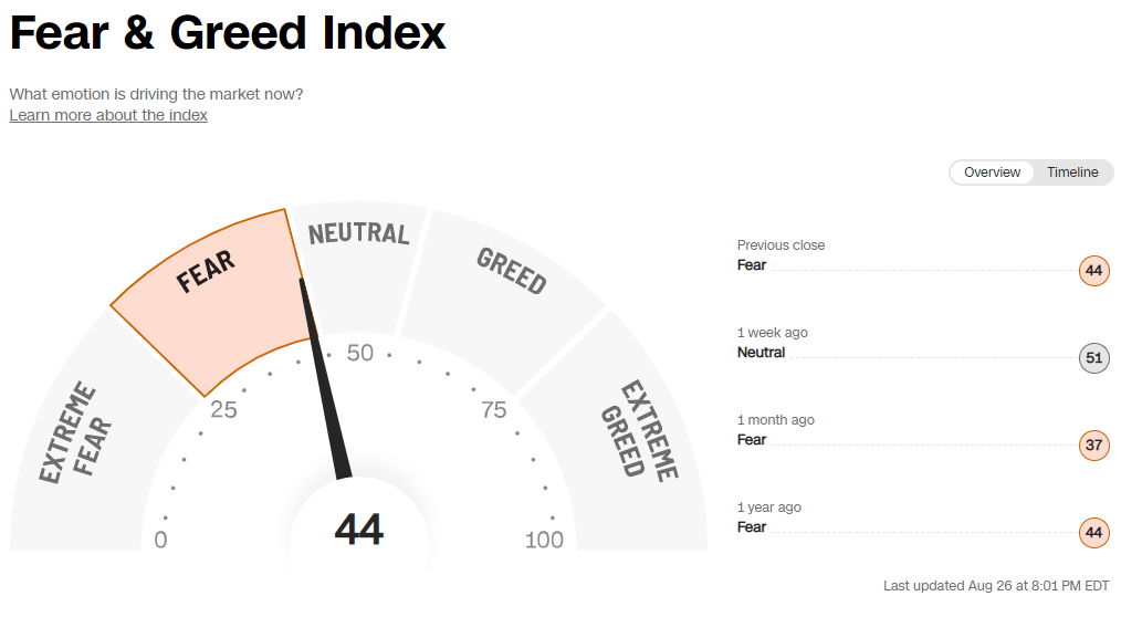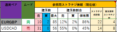 現在の有効ストラテジーについて下図は「CNN Fear & Greed Index」の現在値です。ジャクソンホール会議後、「44」の「Fear」まで下がってしまいました。32以上68以下の範囲なのでトレードは問題なく続行可能です。![]() 下表は、現在のEURGBPとUSDCADの参照用ストラテジ情報です。 ![]() 現在、EURGBPの参照用ストラテジは、売建玉と買建玉が両立しています。そのため、各通貨ペアにおけるストラテジーを有効にすることはできません。 一方、USDCADの参照用ストラテジは、売建玉のみのため、各通貨ペアにおけるストラテジーを有効にすることができます。なお、市況ではUSDが強いのにもかかわらず、売建玉を保有しやすい状況のため、数量を制限して5(千)とします。 以下に、本日有効にしたストラテジーについて掲載します。
