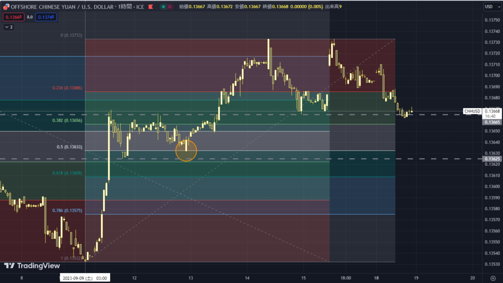 上図を確認すると、9/1 7:00から下落した値幅に対して0.786までの戻りについては、苛烈に上昇しているのがわかります。